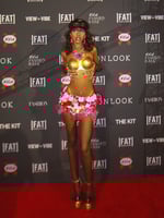 A one-of-one couture riot on a denim mini base, hand-draped in shattered necklaces and reclaimed jewellery — every chain, charm, and crystal sewn by hand (50 hrs). Voluminous black tulle hem drifts with every move, crowned by a dramatic side-bloom of gathered iridescent pink fabric that flashes like spilled oil. Fully lined with luxe satin for a smooth, second-skin feel. CB zipper closure. No two skirts ever alike. Model wears custom fit.