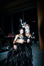 A one-of-a-kind, sheer black metallic lamé organza masterpiece that pours down to the floor like liquid darkness. Dozens of hand-cut and gathered ruffles cascade in endless tiers, catching every speck of light and throwing it back as molten silver-black shine, while remaining completely see-through for maximum drama and skin-flashing attitude.